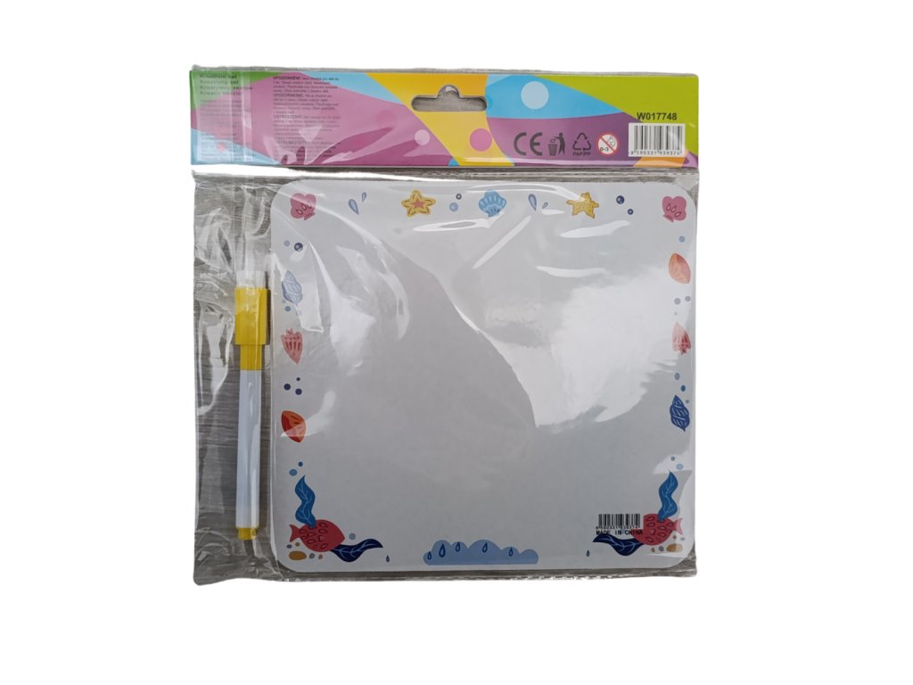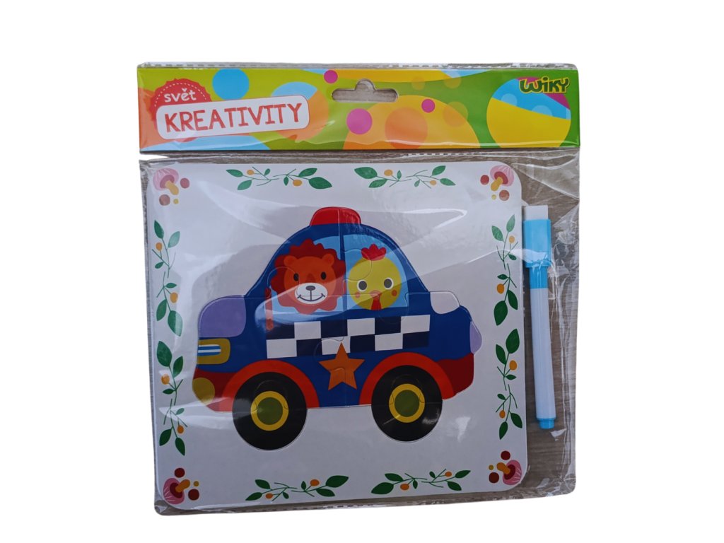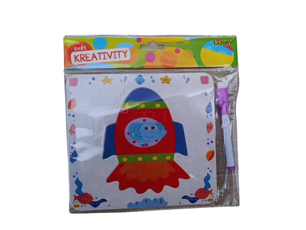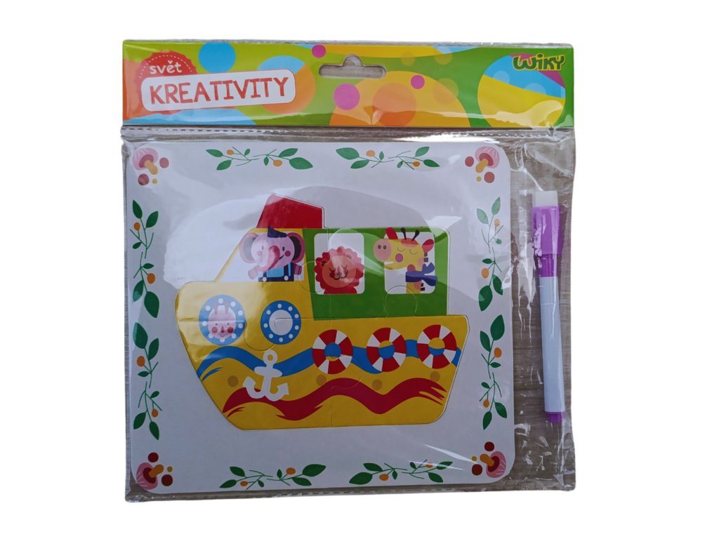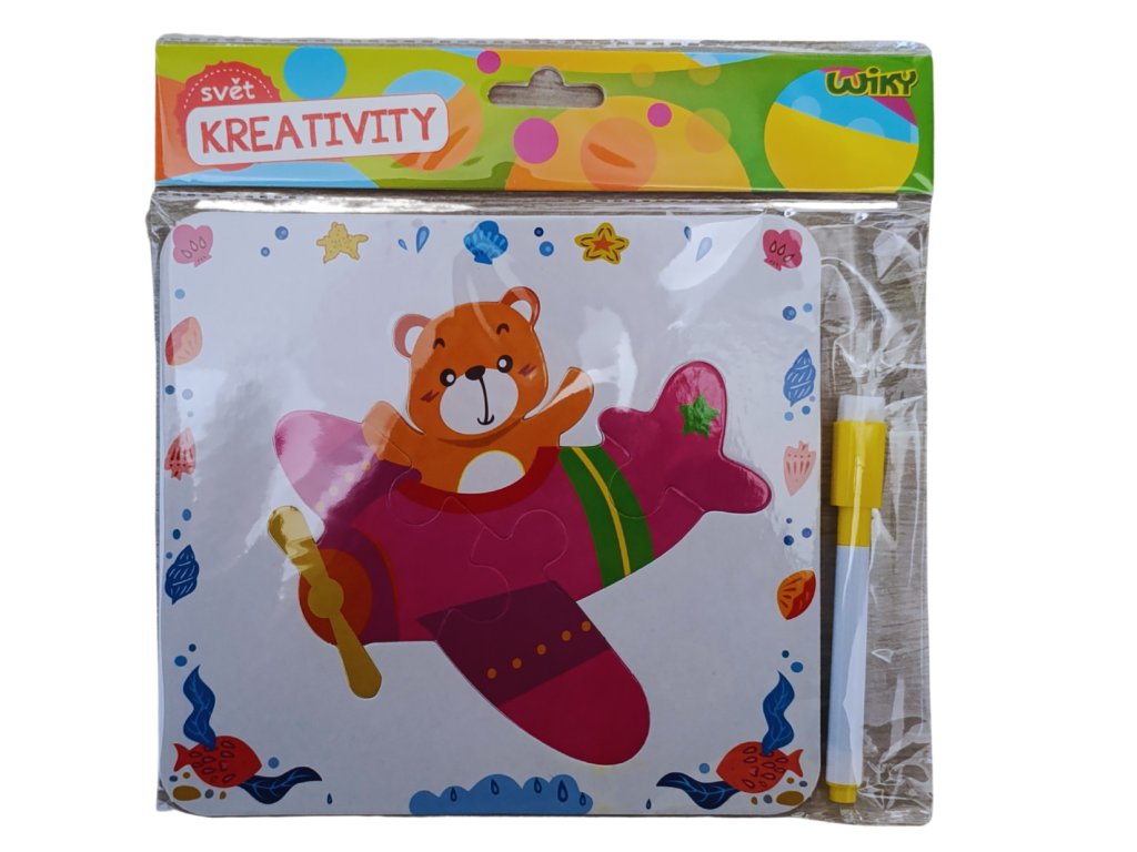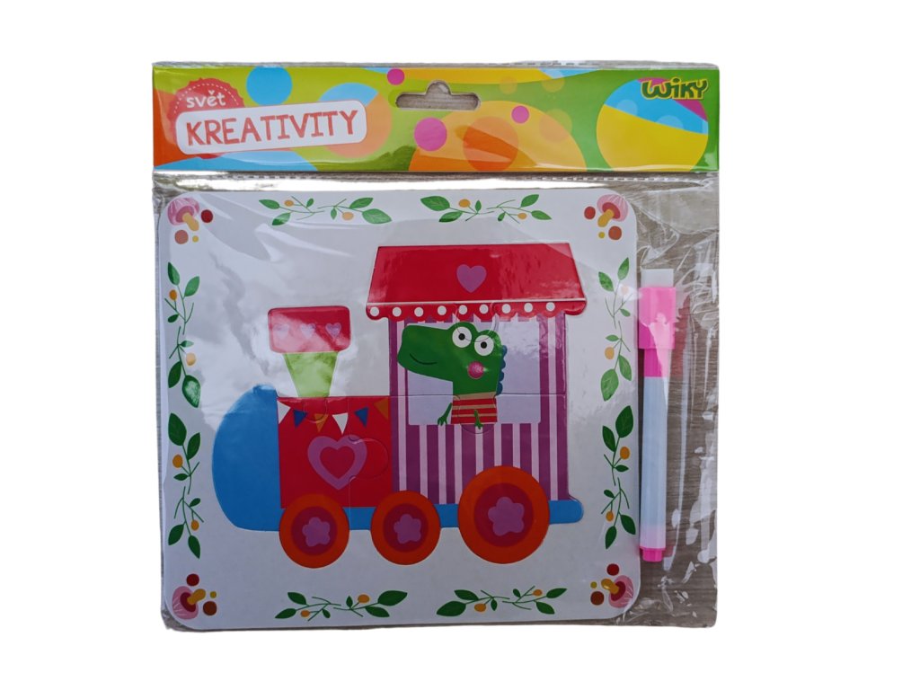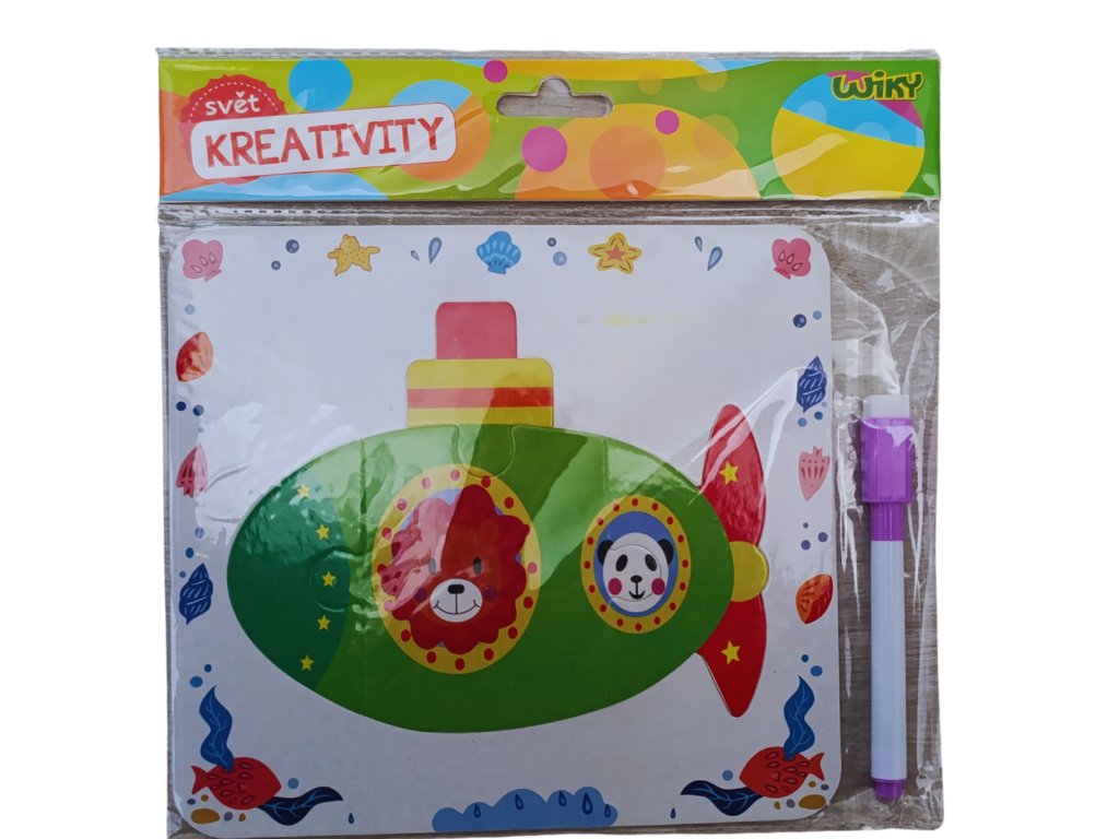 Kreativní set 2v1 s motivy zvířátek. Jedna strana obsahuje puzzle a druhá strana tabulku, na které lze psát přiděleným fixem.