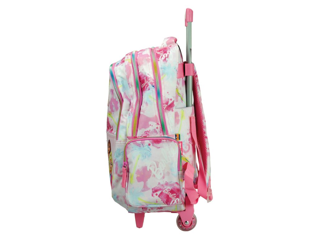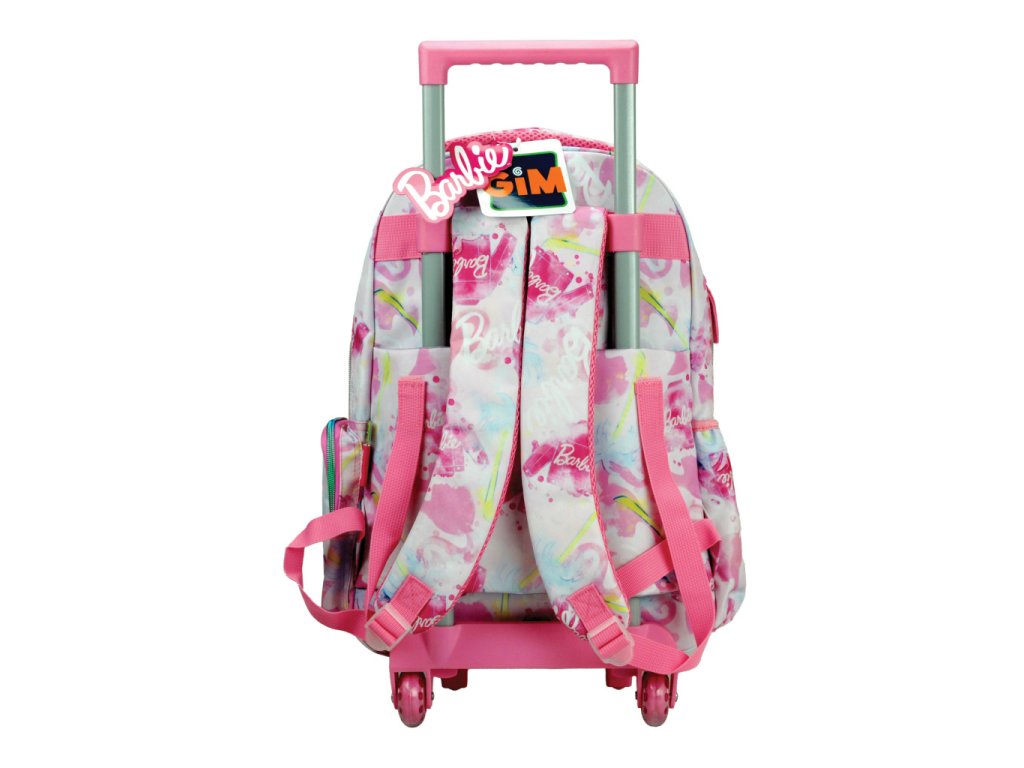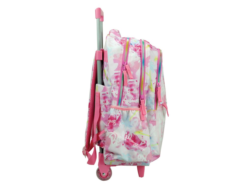Moderní batoh Barbie na kolečkách zaujme dívčím růžovým designem s motivem Barbie a barevnými detaily. Díky výsuvné rukojeti a pevným kolečkům je ideální pro pohodlné každodenní použití bez zbytečné zátěže zad. Batoh lze také nosit klasicky na zádech díky nastavitelným popruhům.