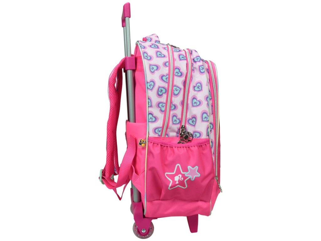 Moderní batoh Barbie na kolečkách v růžovém designu s oblíbeným motivem Barbie je ideální do školy, na výlety i cestování. Díky výsuvné rukojeti a pevným kolečkům usnadňuje přenášení a šetří záda dítěte. Batoh lze pohodlně nosit také na zádech díky nastavitelným ramenním popruhům.