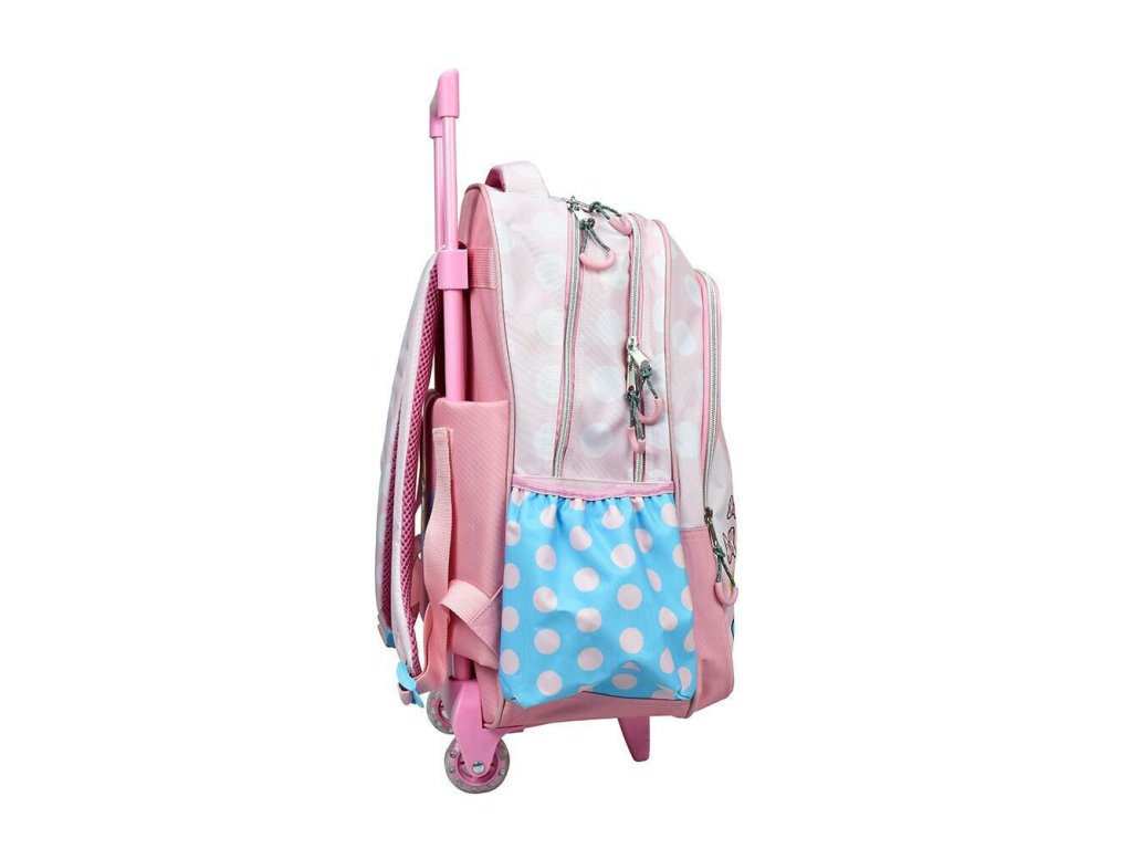 Batoh zaujme veselým růžovým provedením s motivem Minnie, puntíky a barevnými detaily. Výsuvná rukojeť a pevná kolečka umožňují snadnou manipulaci i pro menší děti. Prostorné vnitřní uspořádání poskytuje dostatek místa na učebnice, sešity, svačinu i další potřeby.