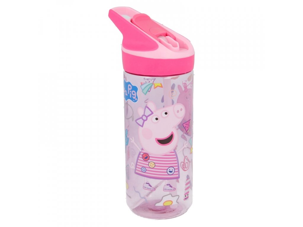 Usměvavá slečna Pepina je velmi aktivní a žízeň je potřeba zahánět. Děti také bývají ve velkém pohybu a pitný režim s tritanovou lahví Peppa Pig dodrží velmi snadno. Tuto lahev si děti velmi rychle oblíbí. Láhev je vyrobena z prakticky nerozbitného tritanu, inovativního materiálu, který neobsahuje BPA (bisfenol A). Lahev se snadno drží a má jednoduchou odolnou výlevku na pití nahoru/dolů, ze které se pohodlně pije. Pítko se snadno lehkým tlakem zaklopí, je tedy hygienicky kryto a tlačítkem umístěným na lahvi se opět velmi rychle vysune.