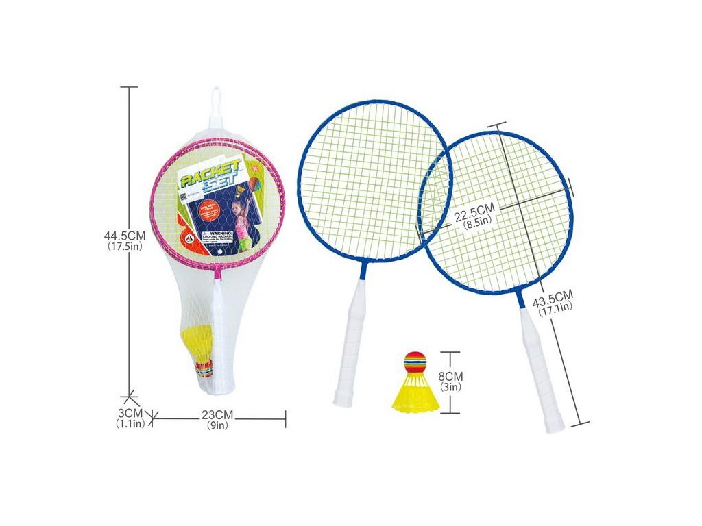 Badminton set. Délka 44 cm. Obsah balení - 2 rakety a 1 pěnový míček. 2 varianty - modrá, růžová - v ceně 1 set - barevnou variantu uveďte do poznámky