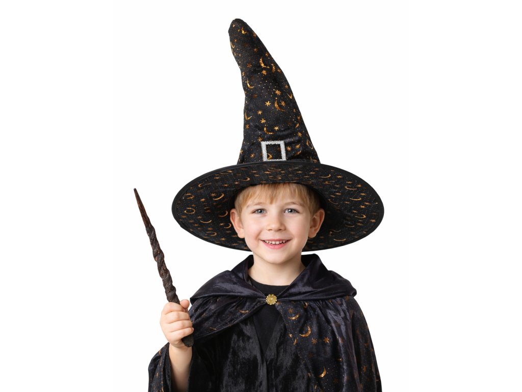 Čarodějnický klobouk o průměru 38 cm je ideálním doplňkem ke kostýmu malého čaroděje, čarodějnice nebo kouzelníka. Skvěle se hodí na karneval, Halloween, pálení čarodějnic, tematické párty, školní besídky i focení kostýmů.