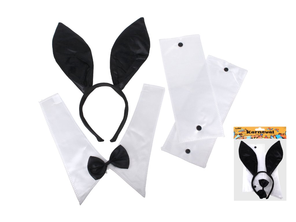 Set karneval zajíc. Obsahuje čelenka uši, motýlek na krk s límcem, manžety na ruce.