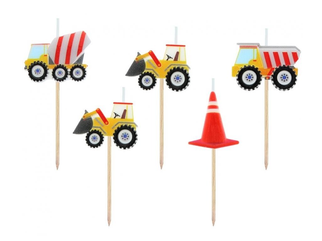 Sada obsahuje 5 svíček s motivy stavební techniky, jako jsou míchačka, bagr, nakladač, nákladní vůz a dopravní kužel. Barevné provedení a hravé detaily potěší malé fanoušky stavebních strojů a skvěle doplní tematickou výzdobu. Díky praktickým dřevěným zápichům svíčky snadno umístíte do dortu, cupcakes nebo jiných dezertů.