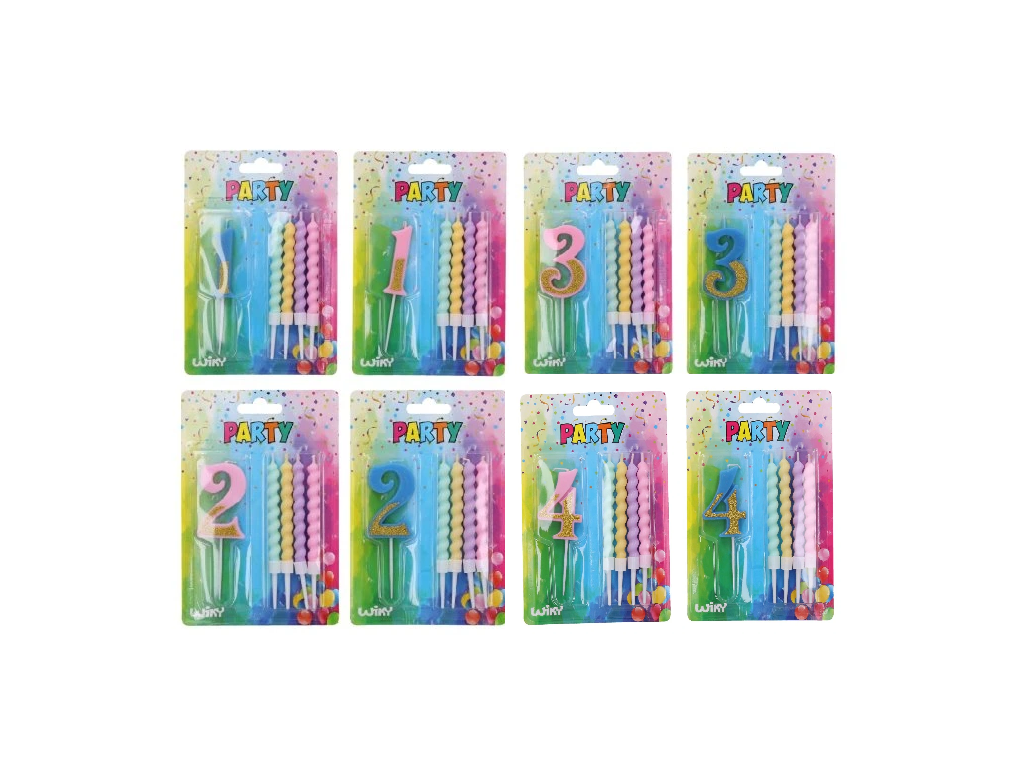V balení najdete jednu svíčku ve tvaru čísla a čtyři tenké barevné svíčky, které společně vytvoří harmonický celek. Číslice pomáhá zvýraznit věk oslavence, zatímco doplňkové svíčky dodají dortu pestrost a styl.
