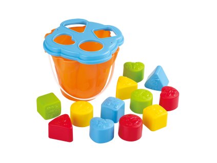 Barevný kyblík s pěti tvary na víčku, kterými můžeš vkládat 15 barevných kostiček. Zábavná hra pro nejmenší, která rozvíjí jemnou motoriku a poznávání barev a tvarů.