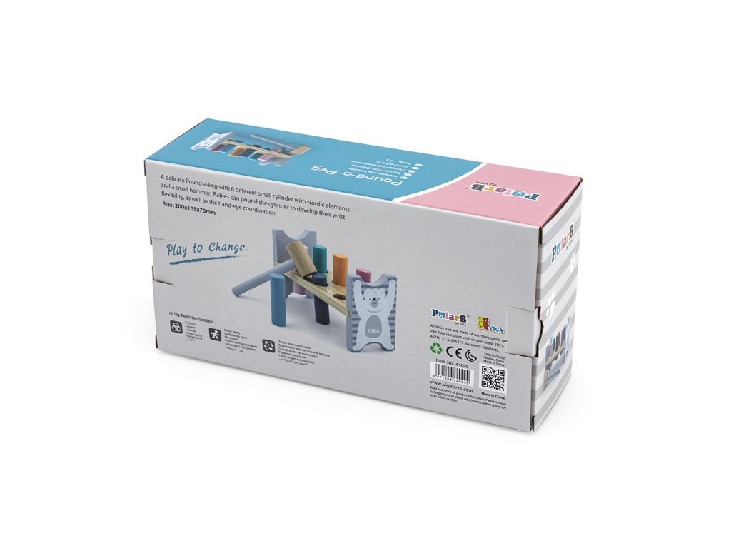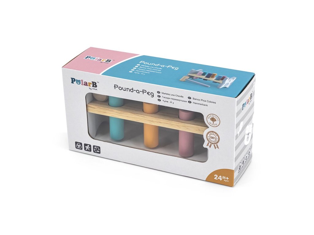 Barevná, dřevěná zatloukačka Viga, kterou si zamiluje každé malé dítě. Dřevěná deska se šesti otvory a paličkou pro nácvik zatloukání. Po zatlučení kolíků se stojánek může obrátit a začít zatloukat znovu. Sada obsahuje stojánek, 6 barevných kolíků a paličku.