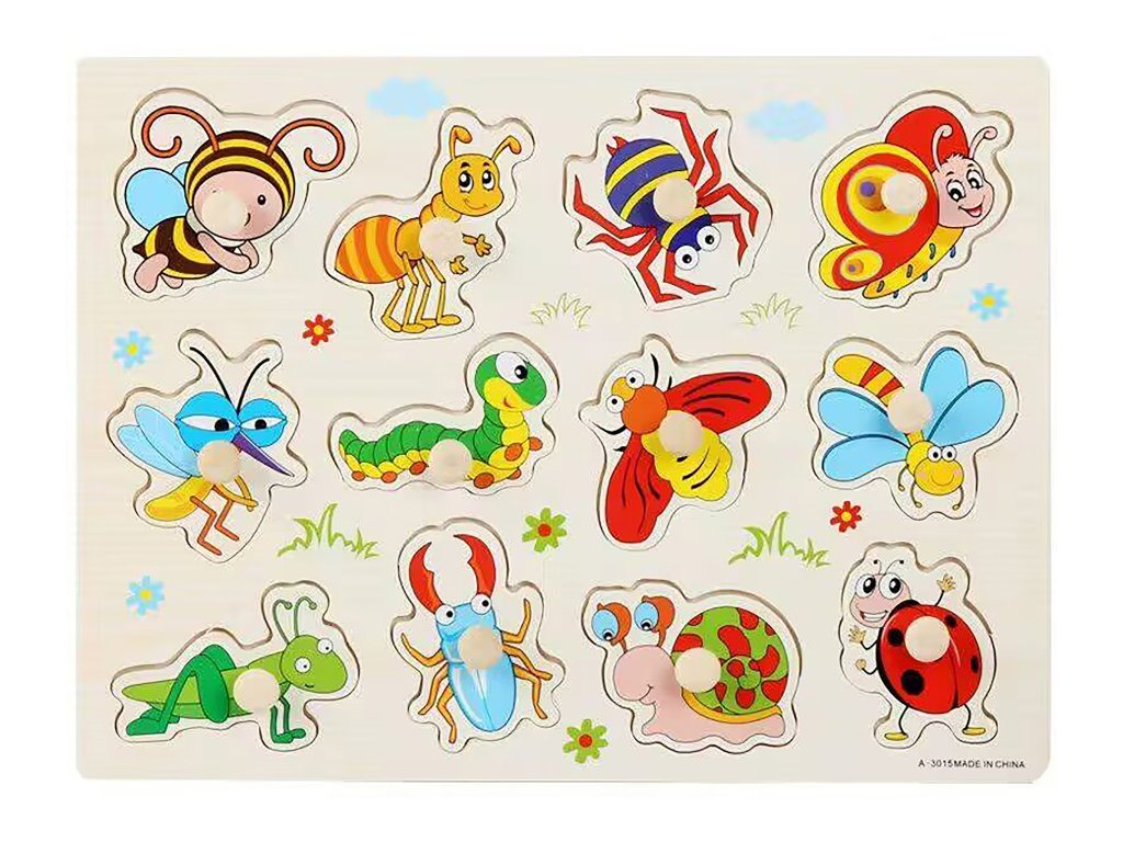 Na dřevěné desce se nachází barevné obrázky hmyzu, například motýl, beruška, mravenec, housenka, šnek nebo pavouk. Každý dílek je opatřen malým kolíčkem, díky kterému jej děti snadno uchopí a vloží na správné místo.