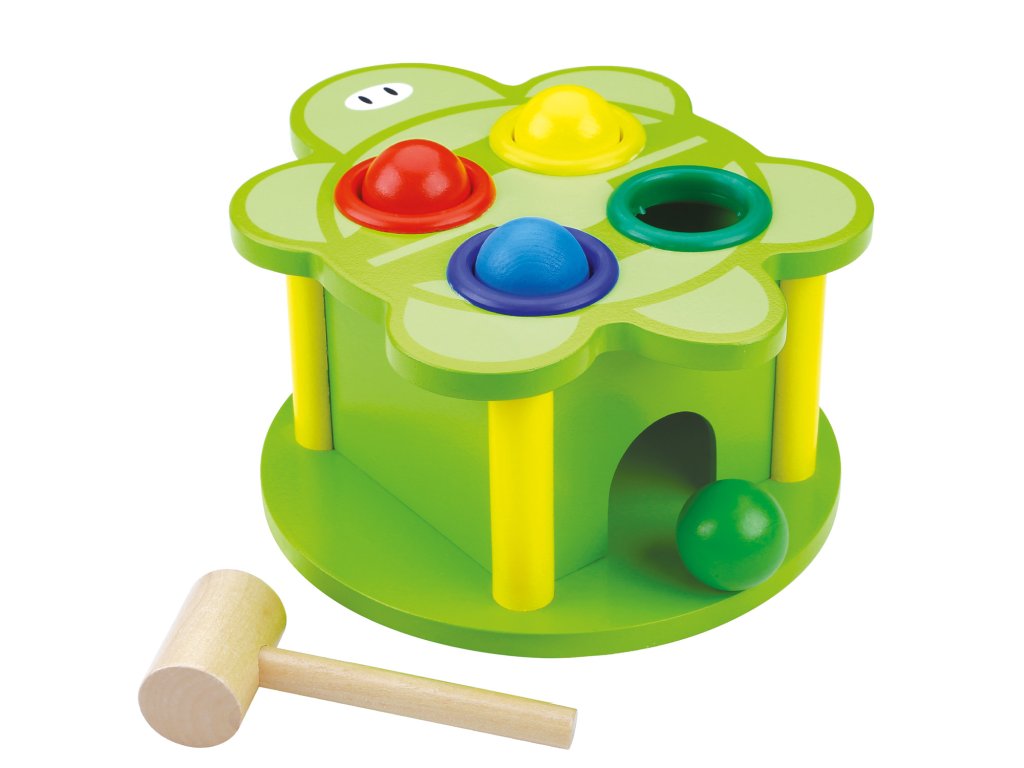Barevná zatloukačka želva se 4 míčky. Hra je vyrobená z masivního a kvalitního dřeva má pevnou konstrukci, která vydrží roky klepání bez deformace. Každý míček má na vršku želvy specifický otvor pro svou barvu. To je skvělá funkce, která vašemu dítěti pomůže rozpoznat a sladit barvy.