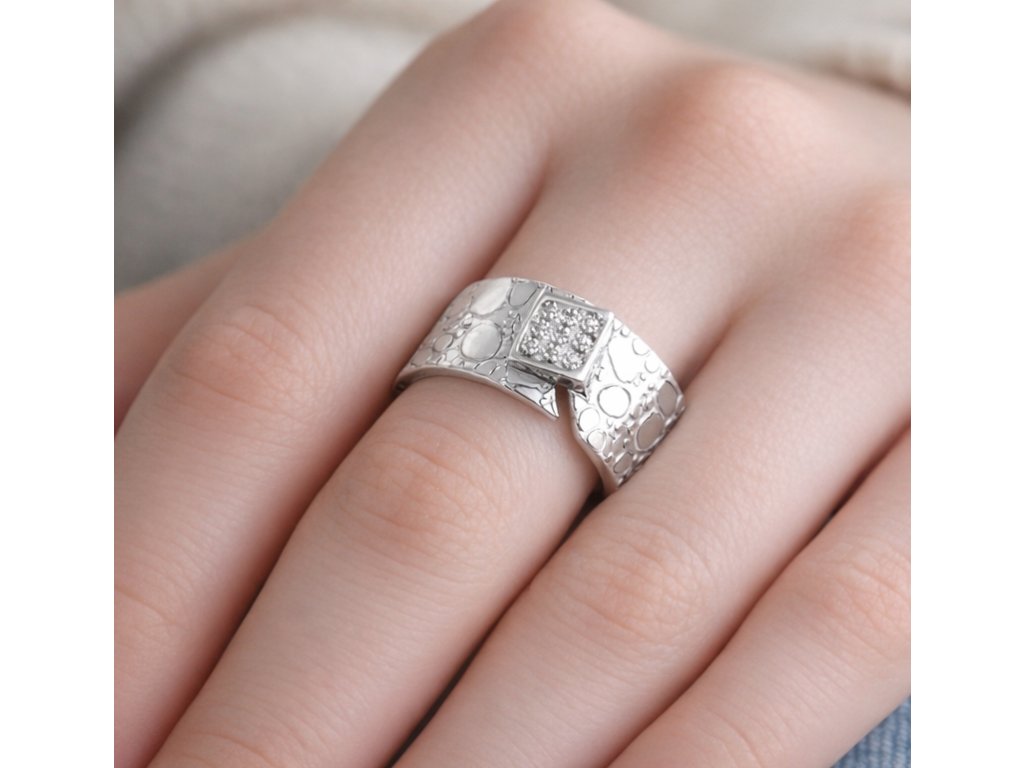 Elegantní prsten se třpytivými kamínky je ideálním doplňkem pro každodenní nošení i slavnostní příležitosti. Díky širokému designu působí výrazně a luxusně, přesto si zachovává nadčasovou eleganci. Precizně vsazené kamínky dodávají prstenu jemný lesk, který zaujme na první pohled.