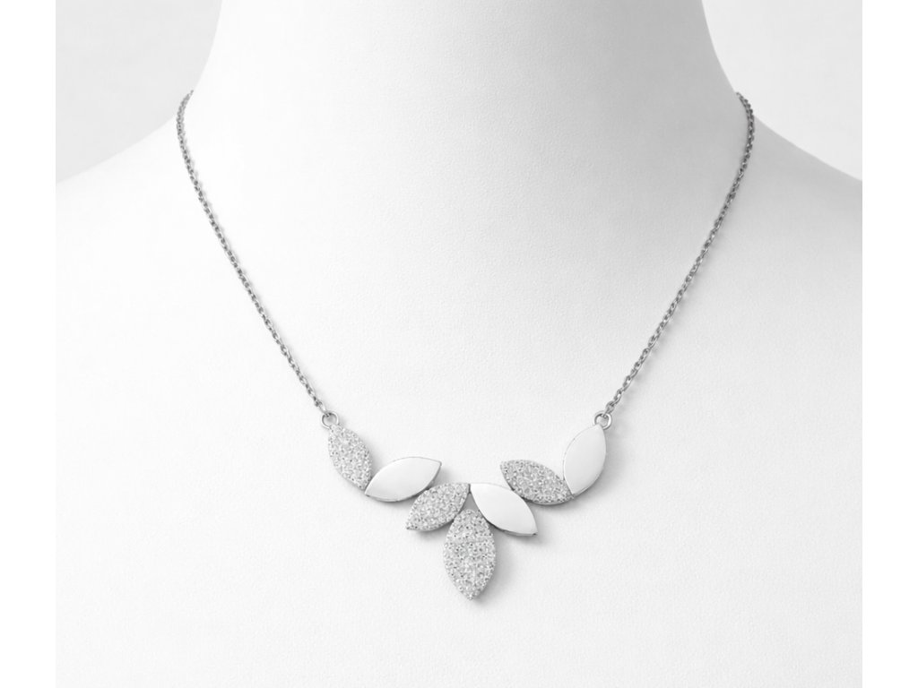 Elegantní řetízek na krk se zdobenými lístečky ve stříbrné barvě je jemným a nadčasovým doplňkem pro každodenní nošení i slavnostní příležitosti. Moderní design s kombinací hladkých a třpytivých lístků krásně vynikne na krku a dodá outfitu ženskost a lehkost.