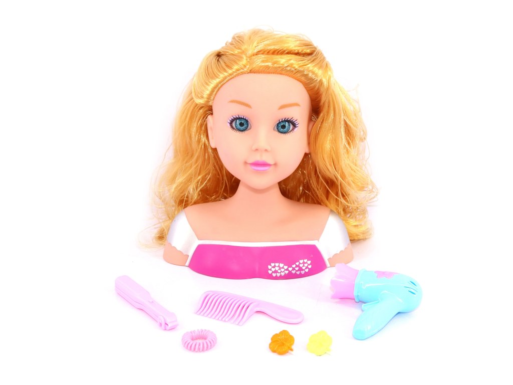 Obsah - hlava, fén, kulma, hřeben, 2 sponky, gumička.