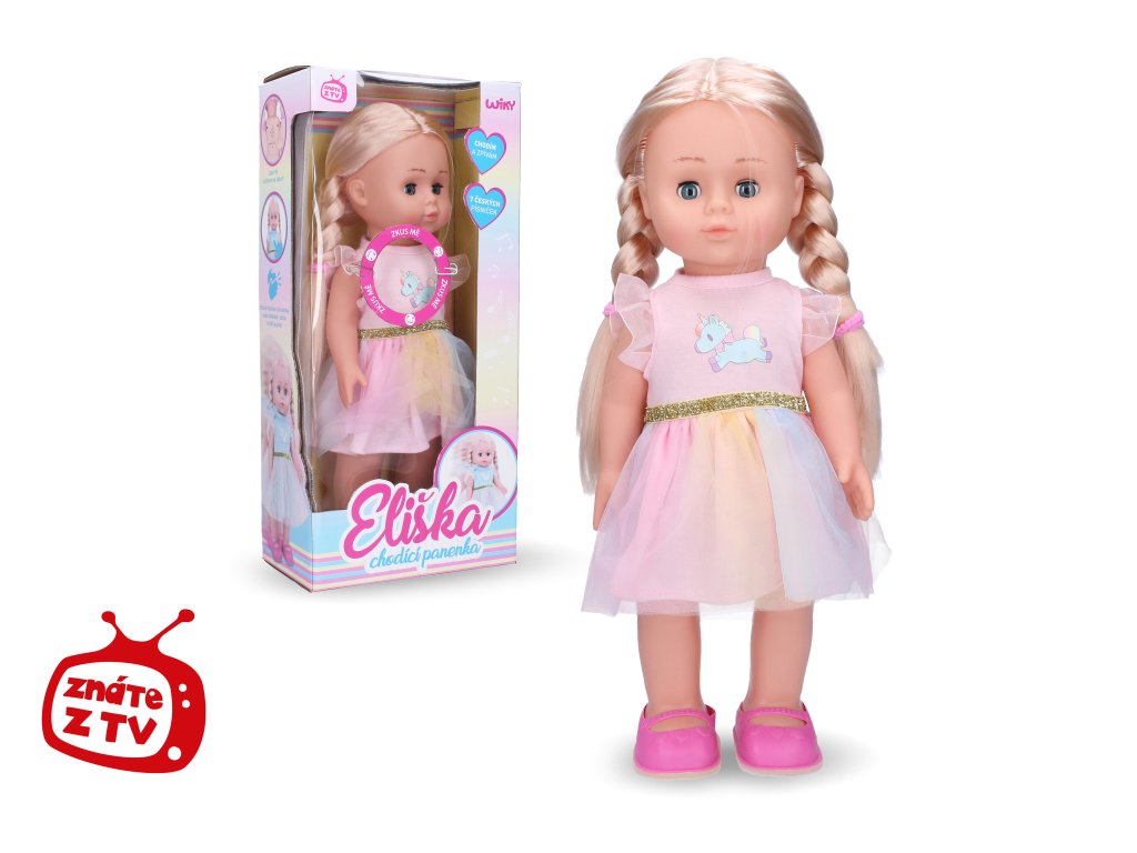 Začni den se svou nejlepší kamarádkou Eliškou. Eliška také ráda chodí a tančí. Vezmeš ji na procházku? Panenku Elišku si zamiluješ! Čeká vás spousta hraní a zábavy! Eliška je chodící panenka, která mooc ráda zpívá! Chceš si s ní zazpívat? Umí 7 lidových písniček. Stačí tlesknout a přidej se! Travička zelená Kočka leze dírou Červený šátečku Prší prší Já do lesa nepojedu Holka modrooká Kalamajka Velikost: 41 cm Doporučený věk: od 3 let Panenku je možno spustit ve dvou režimech (Try me/ON). V režimu Try me jen zpívá, nechodí. Přepínání na zádech. Baterie: 3x AADoplňkové parametry