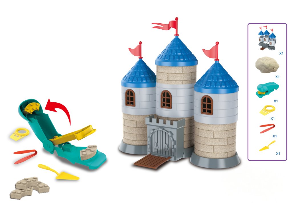 Kinetický písek sada na stavbu s cihliček Hrad. Obsah balení 750g. Obsahuje formu na tvorbu cihliček. Balení také obsahuje díly na stavbu hradu a další nástroje na práci s pískem.