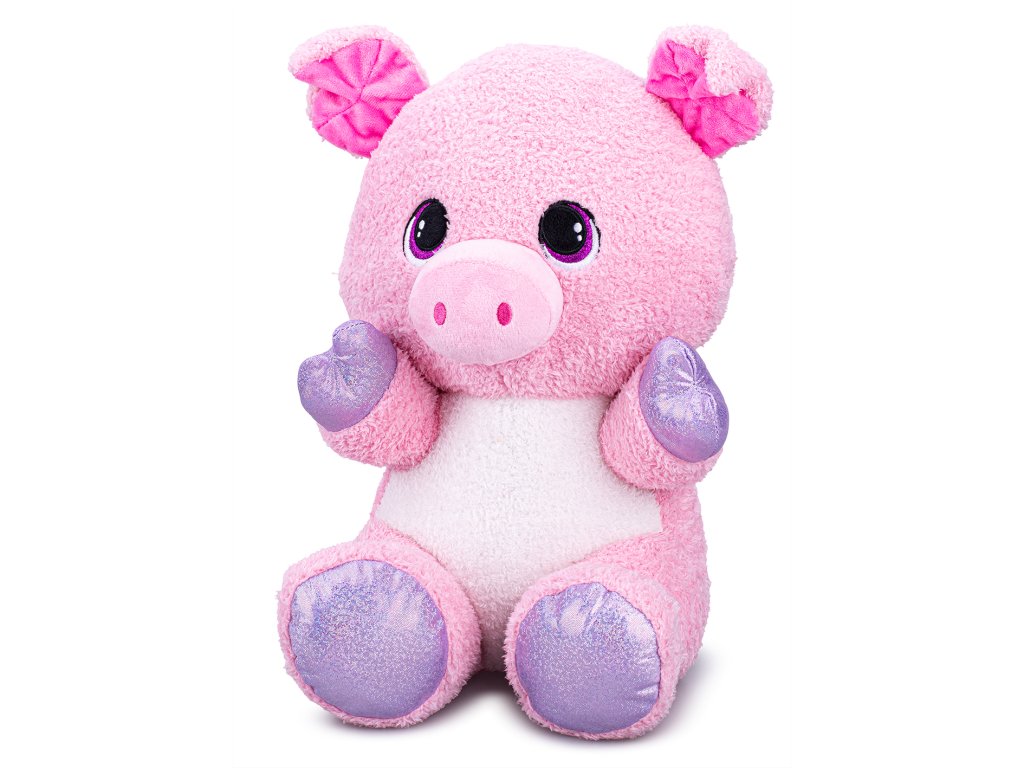 Prasátko má kulatý čumáček, velké lesklé oči a jemně třpytivé tlapky, které mu dodávají veselý vzhled. Díky sedící poloze může zdobit dětskou postel, poličku nebo hrací koutek.