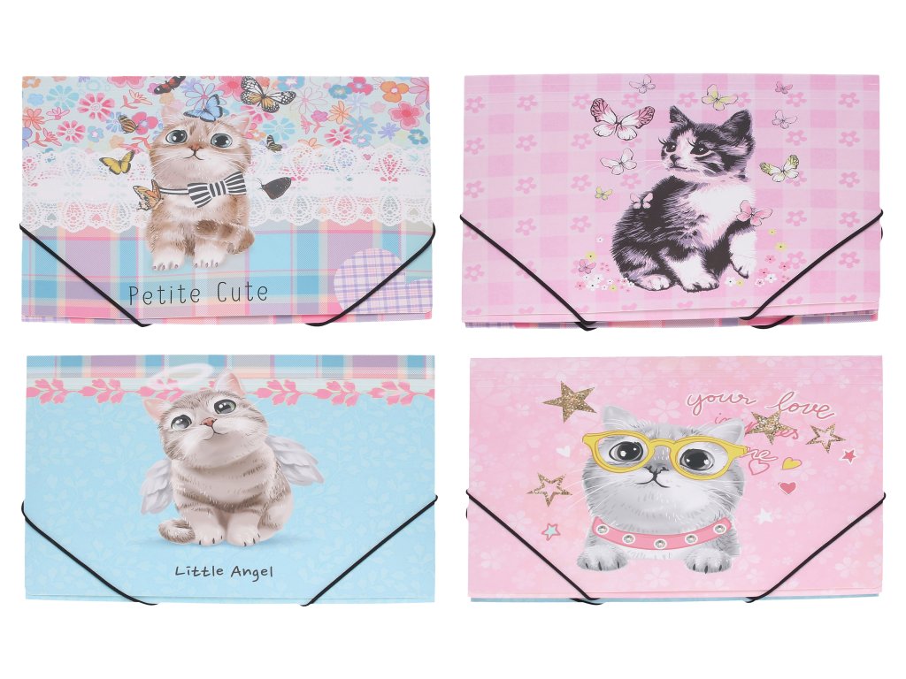 Kočičí elegance, která pohlídá každý papír! Složka s gumou přináší nejen pořádek, ale i radost z každého otevření. Motivy roztomilých koček doplněné květinami, motýly nebo jemnými vzory vytvářejí příjemný vizuální dojem.