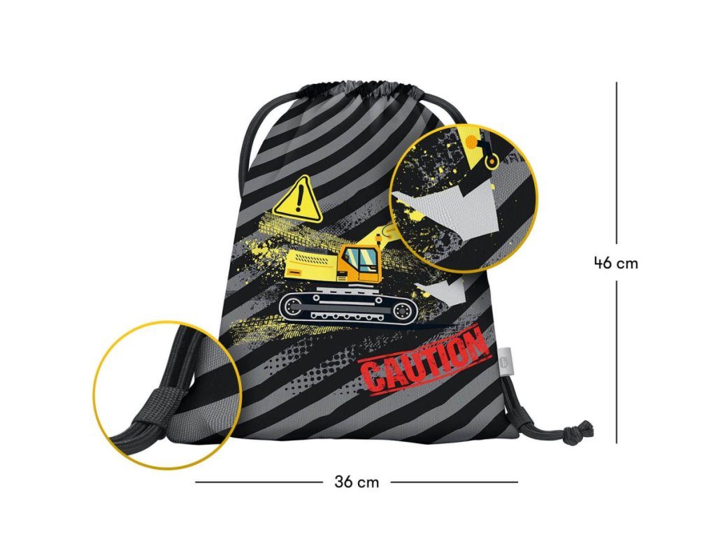 • Sáček na cvičky nebo přezůvky z pevného omyvatelného materiálu.• Zdrhování pomocí pevných tkanic, které zároveň umožňují nošení na zádech.