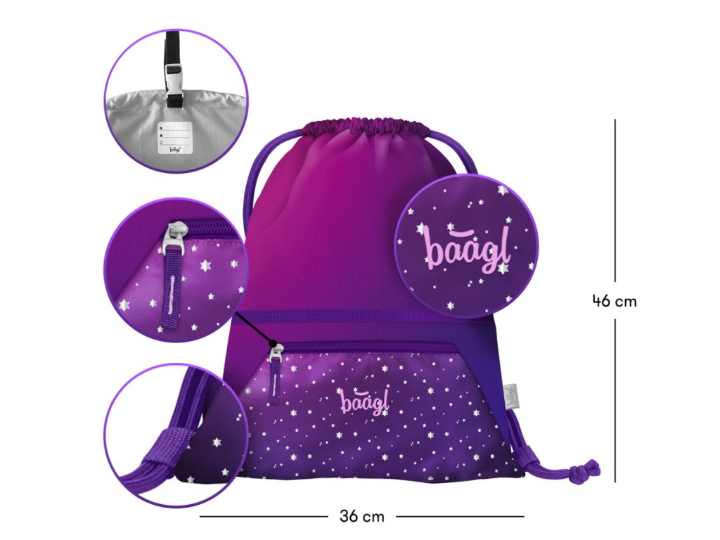 • Praktický sáček s kapsou na zip je vhodný nejen na přezůvky do školy, ale také na cesty, do města, na sportovní či jiné volnočasové aktivity.• Vyroben z pevného, omyvatelného materiálu a vybaven pevnými tkanicemi pro pohodlné nošení.