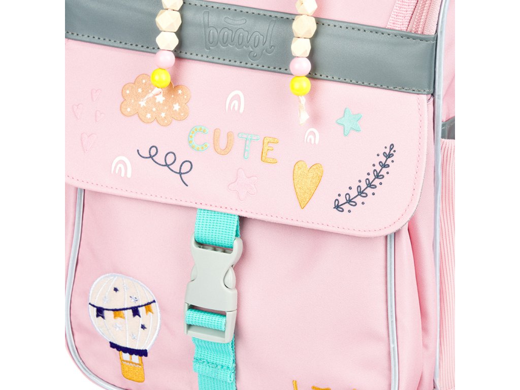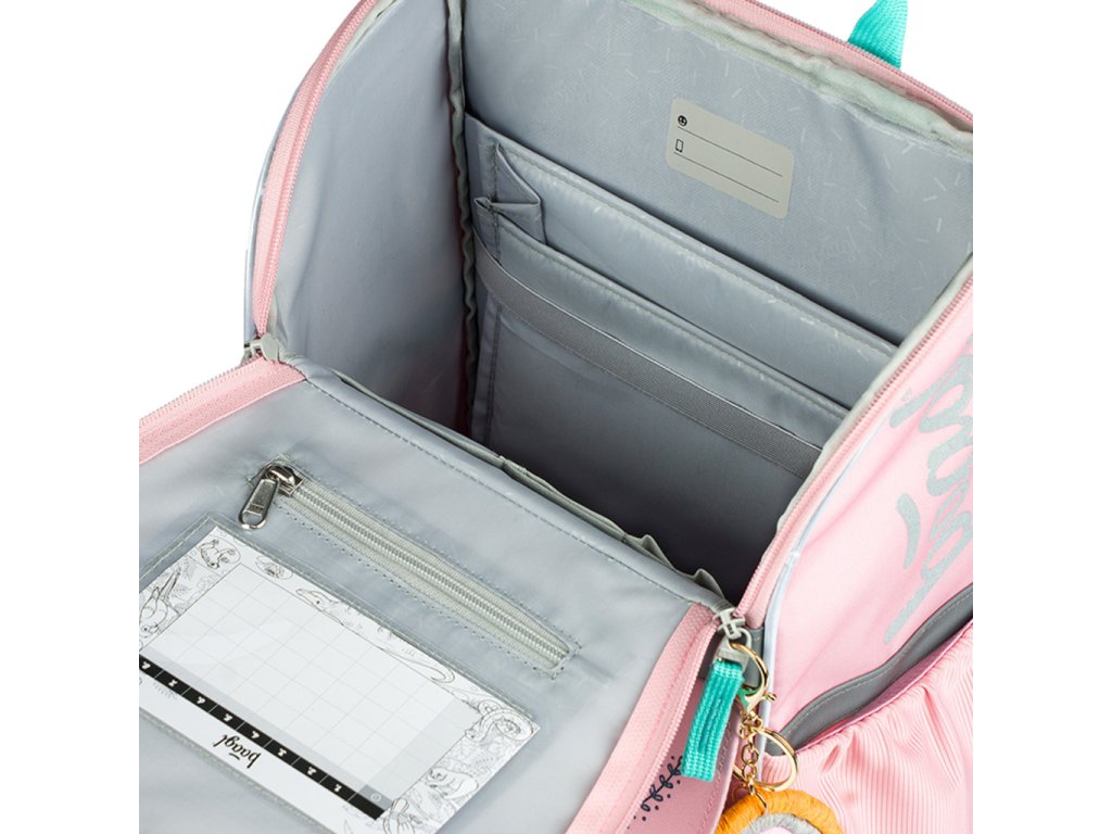 • Uvnitř aktovky je průhledná kapsa na rozvrh a vnitřní organizér umožňující rovnoměrné rozložení hmotnosti, doplněný gumičkou pro fixaci.