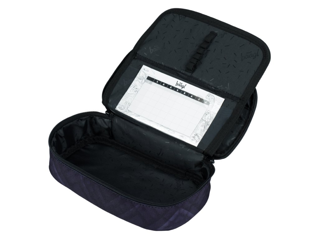 • Pevný školní penál s výklopnou vnitřní přepážkou.• Vnitřní kapsa na zip a kapsa na rozvrh.