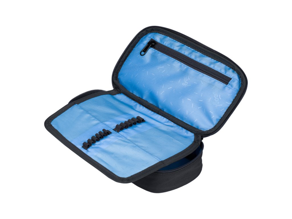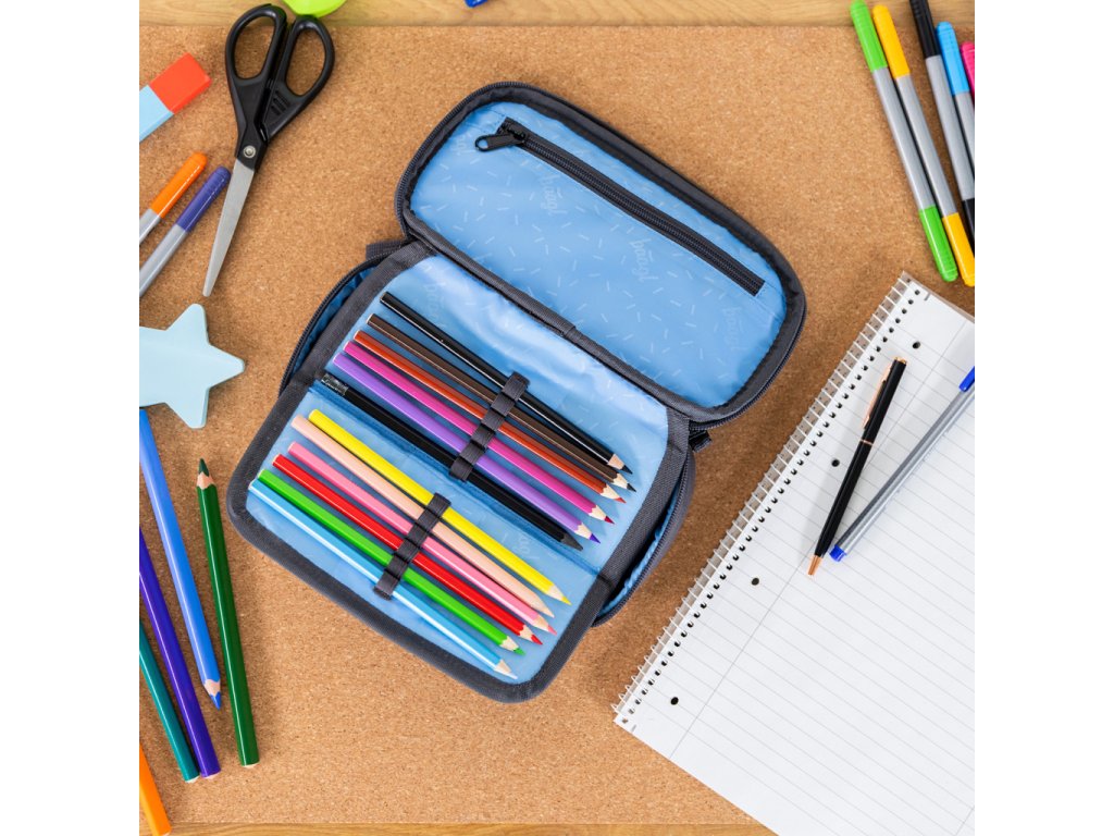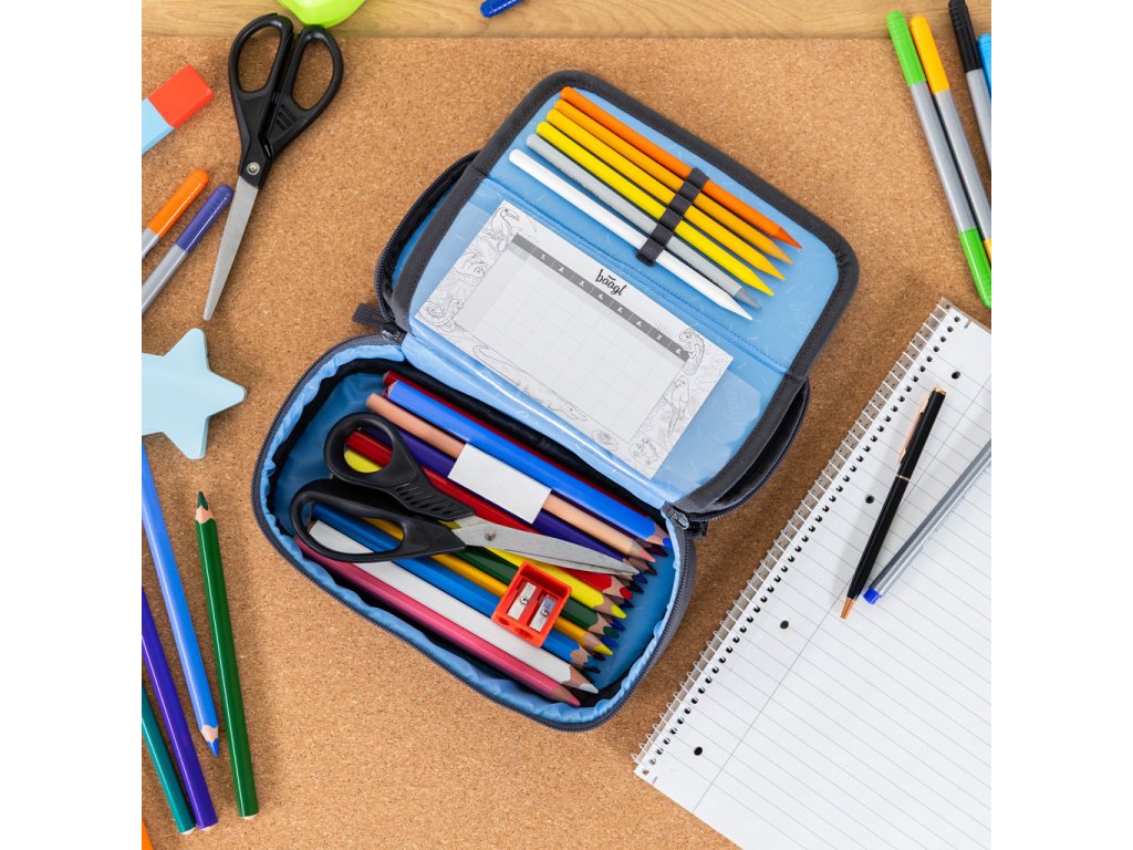 • Kompaktní penál na zip s prostornou hlavní komorou a dvojitou výklopnou chlopní nabízí dostatek prostoru pro psací potřeby i drobnosti.• Součástí penálu je také vnitřní kapsa a okénko na rozvrh hodin.