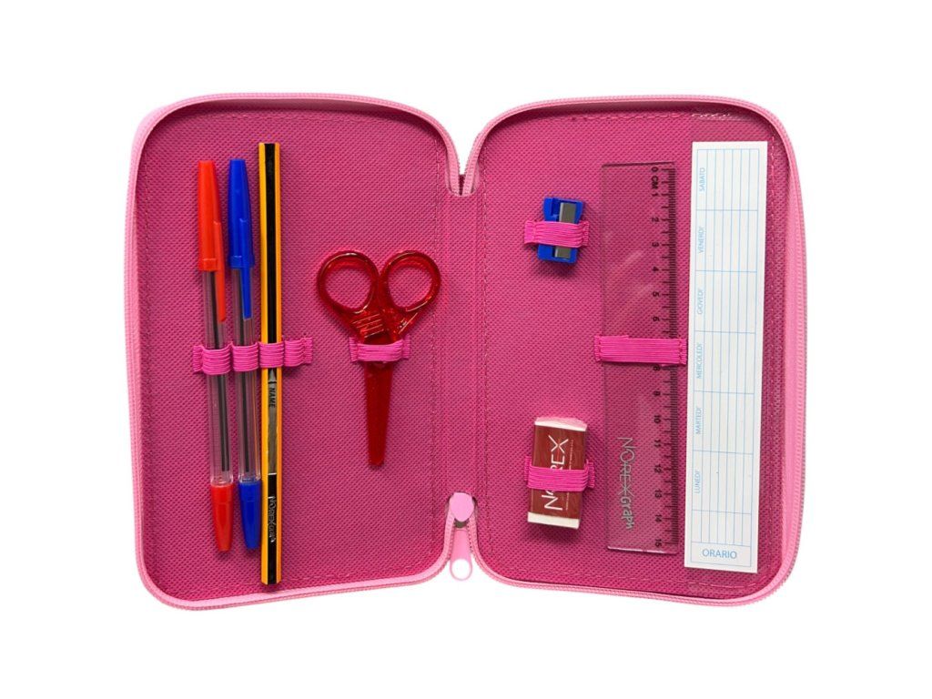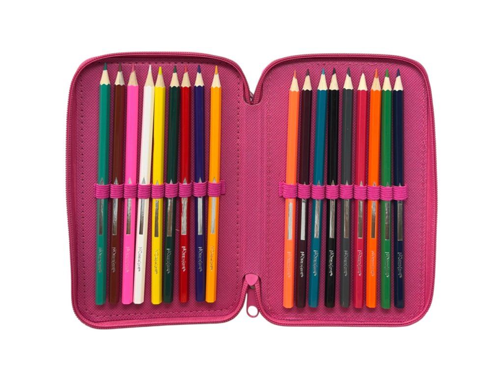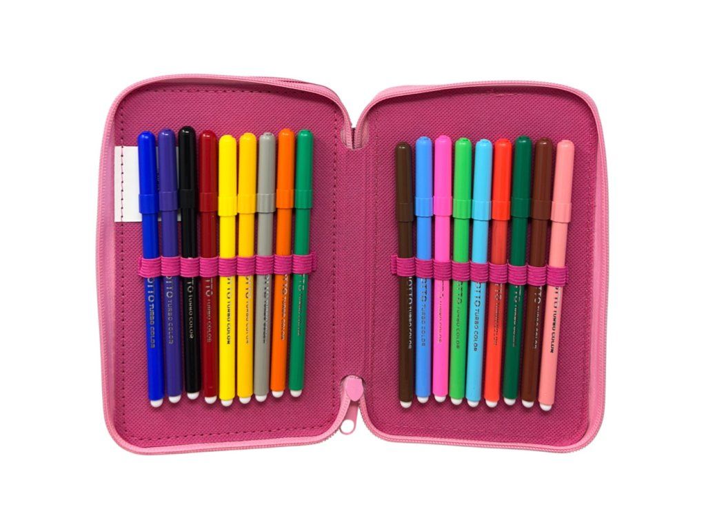 Všechny pomůcky jsou přehledně uchyceny v gumových páskách, takže drží pevně na svém místě. Penál pomáhá dětem udržet pořádek a podporuje jejich kreativitu díky široké paletě barev.