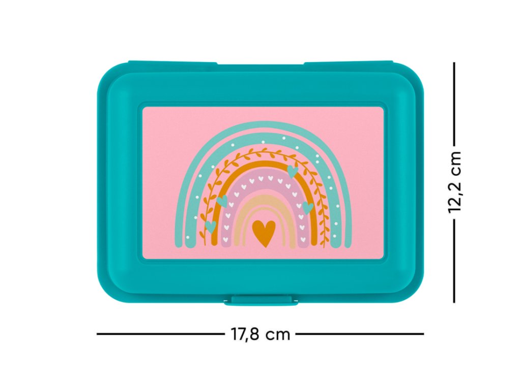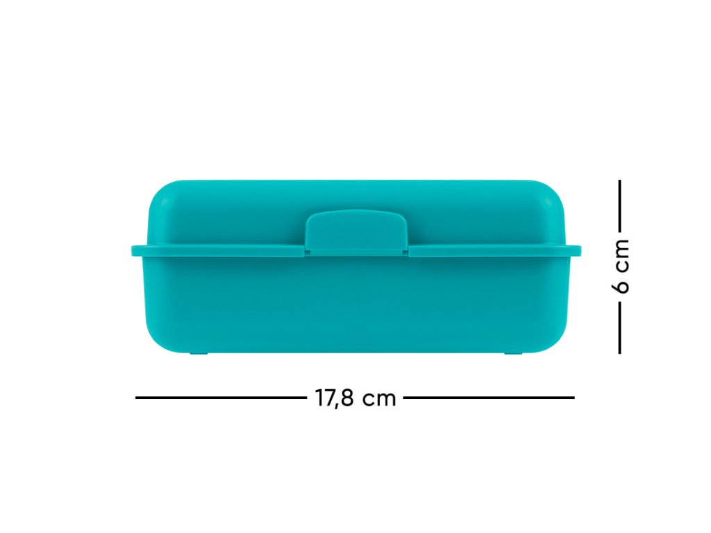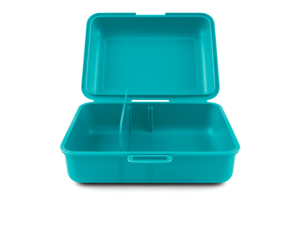 • Plastový box na svačinu v tyrkysové barvě.• Box má uzavírání na jeden zámek a dělicí přepážku.