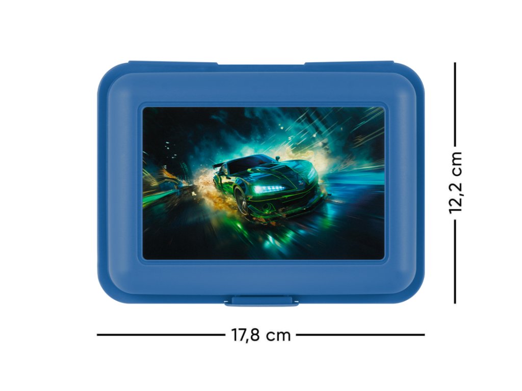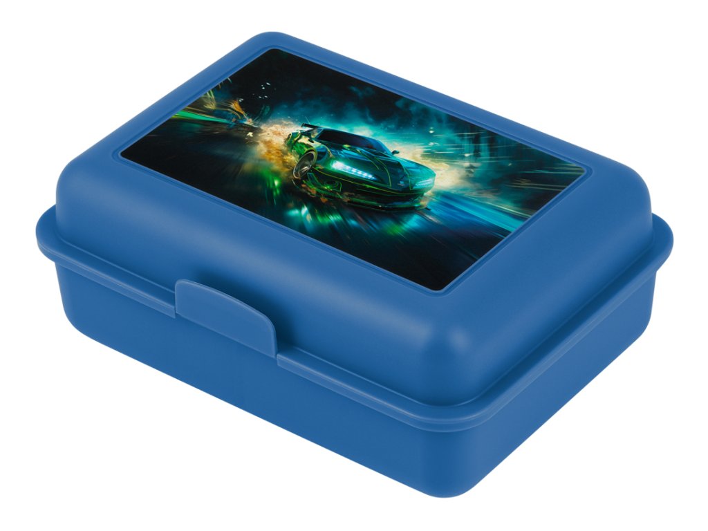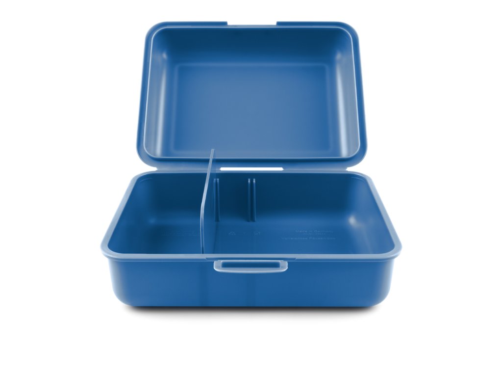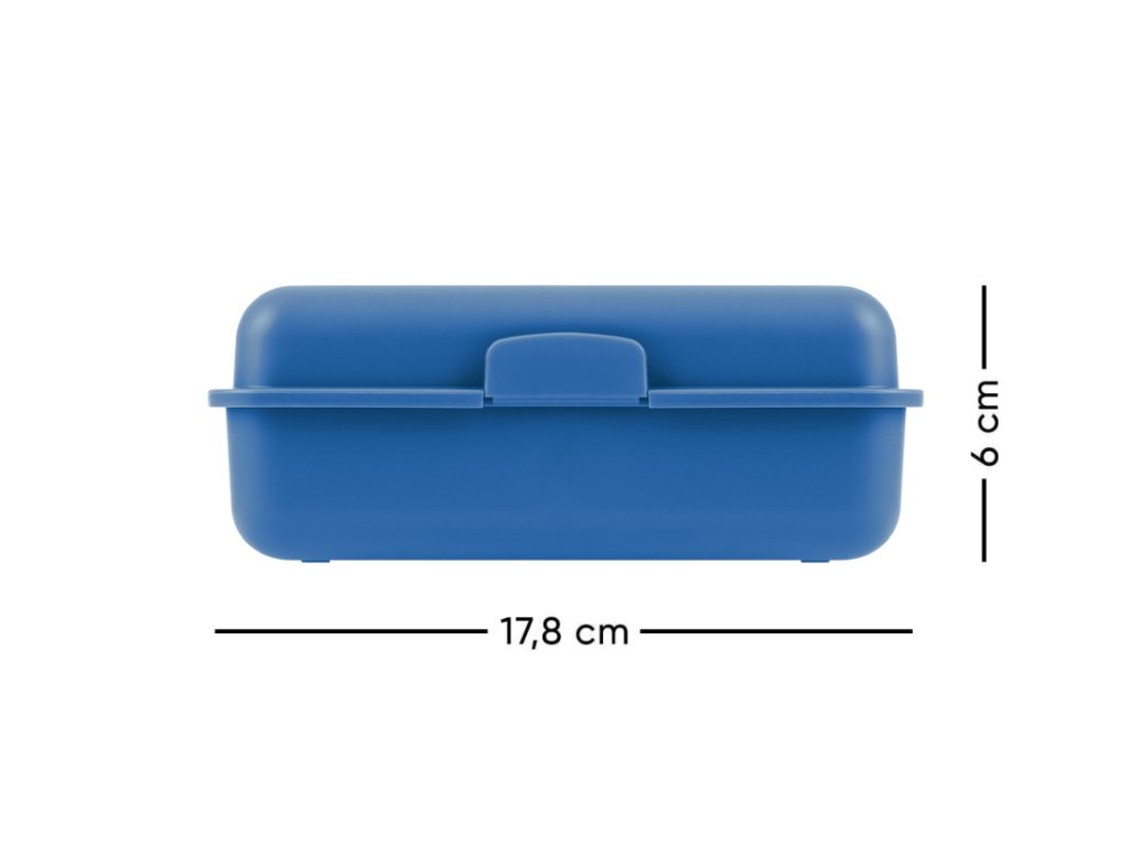 • Plastový box na svačinu v modré barvě.• Box má uzavírání na jeden zámek a dělicí přepážku.