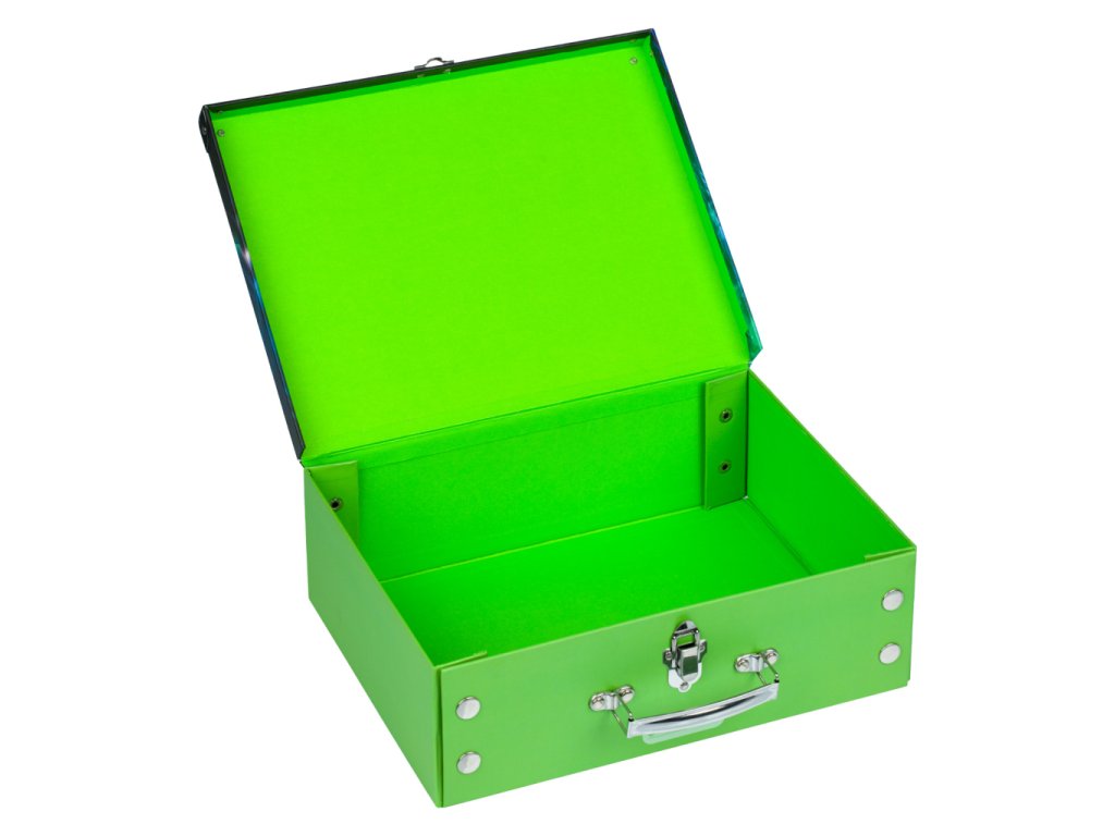 • Skládací kufřík z pevného laminovaného papíru s okovanými rohy.• Unikátní provedení s patentky, díky nimž se dají vždy znovu složit a rozložit.
