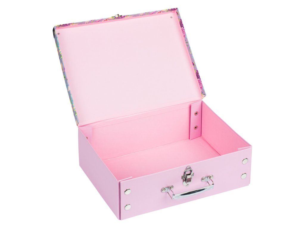 • Skládací kufřík z pevného laminovaného papíru s okovanými rohy.• Unikátní provedení s patentky, díky nimž se dají vždy znovu složit a rozložit.