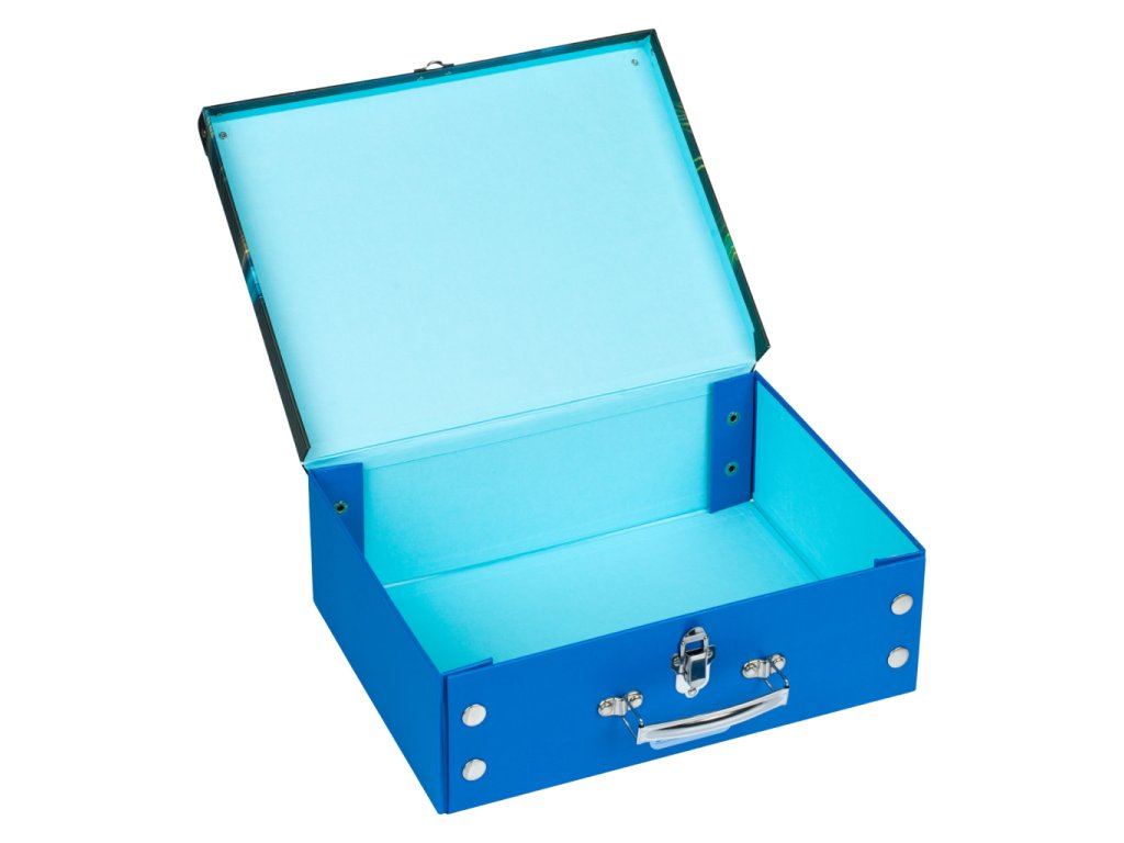 • Skládací kufřík z pevného laminovaného papíru s okovanými rohy.• Unikátní provedení s patentky, díky nimž se dají vždy znovu složit a rozložit.