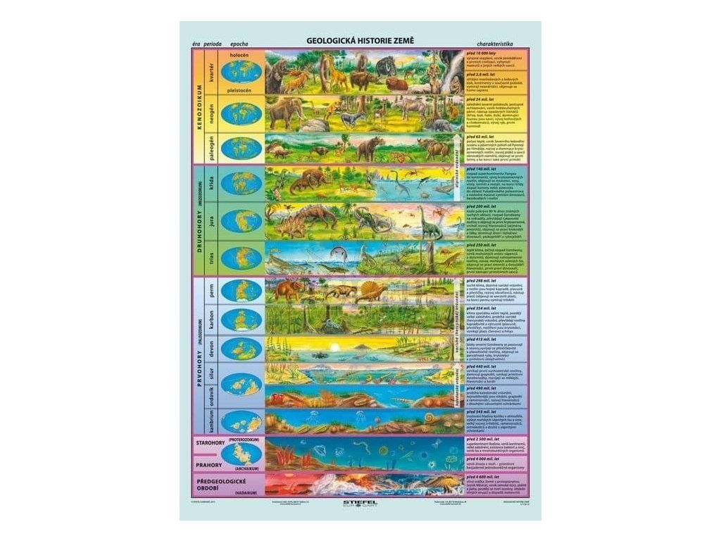 Přední strana nabízí barevně zpracovaný přehled geologických období, vývoje života, změn klimatu i kontinentů. Ilustrace zachycují vznik a zánik druhů, vývoj ekosystémů i zásadní přírodní procesy, které formovaly dnešní svět. Informace jsou podané srozumitelně a v širších souvislostech.