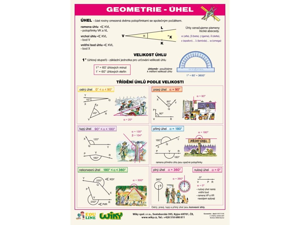 - na přední straně děti najdou vysvětlení základních pojmů – úhel, rameno, vrchol, vnitřní bod úhlu, velikost úhlu, stupeň, minuta, úhloměr a také přehlednou tabulku s tříděním úhlů podle velikosti