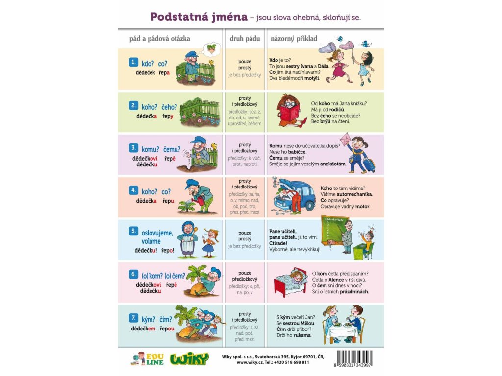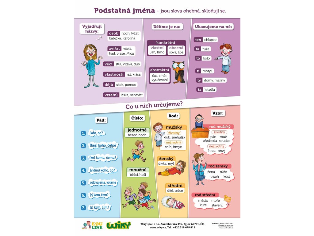 Podstatná jména - pomocná tabulka pro lehčí zvládání učiva. Obsahuje vzory podstatných jmen, mluvnické kategorie, druhy podstatných jmen, na druhé straně najdou děti názorné příklady.