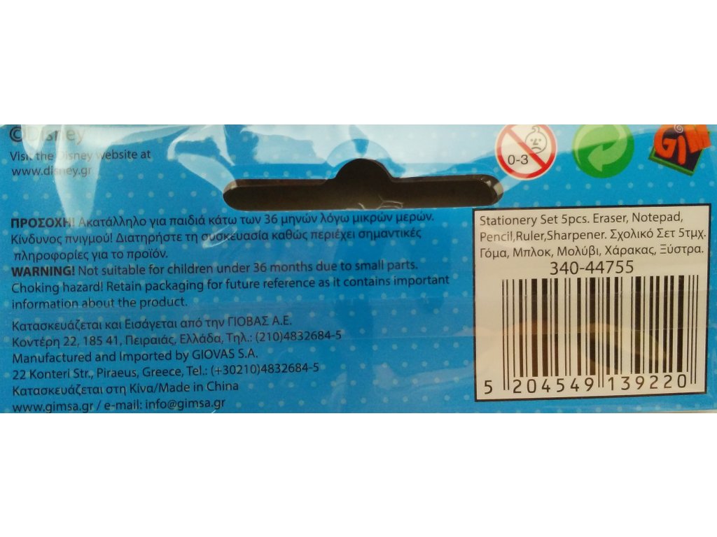 Set obsahuje pravítko, tužku, gumu, ořezávátko a zápisník.