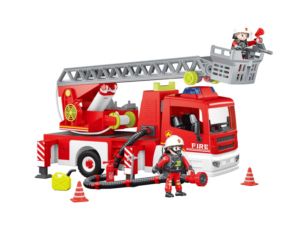 Hasičské auto s žebříkem stavebnice. Velikost 40 cm. Výsuvný žebřík. světelné a zvukové efekty.