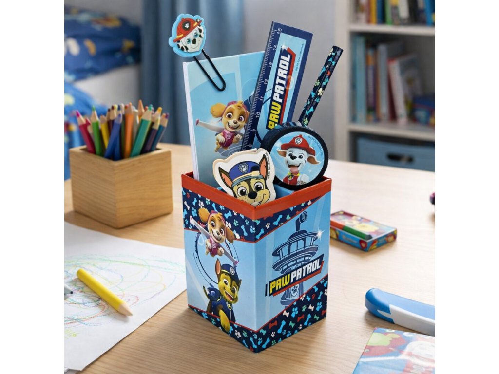 Krásný stojan na psací potřeby v motivu Paw Patrol. Pořádek na psacím stole musí být a o to se postarají pejsci z Tlapkové patroly. Stojan má tři oddělené přihrádky a v setu děti dále najdou malý zápisník, pravítko, gumu, ořezávátko, tužku a sponu.
