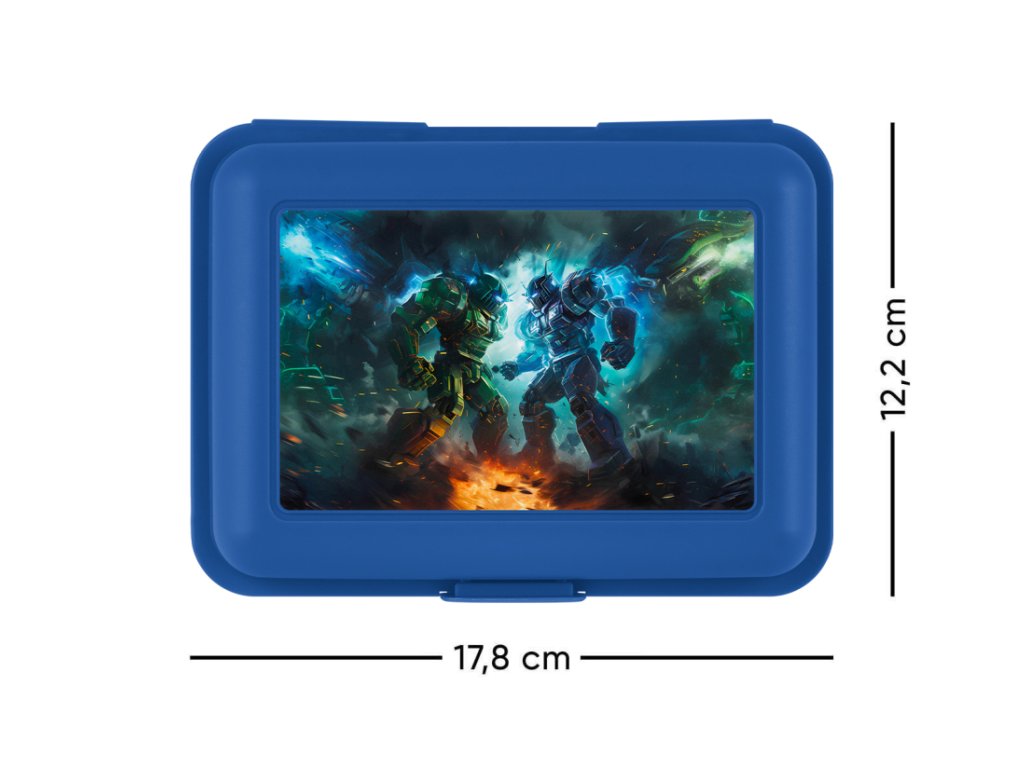 Stylový plastový box na svačinu ROBOTI v modré barvě je ideální volbou pro kluky, kteří milují svět robotů a počítačových her. Praktický svačinový box zaujme moderním herním motivem na víku a zároveň splní každodenní potřeby do školy, na výlety i kroužky.