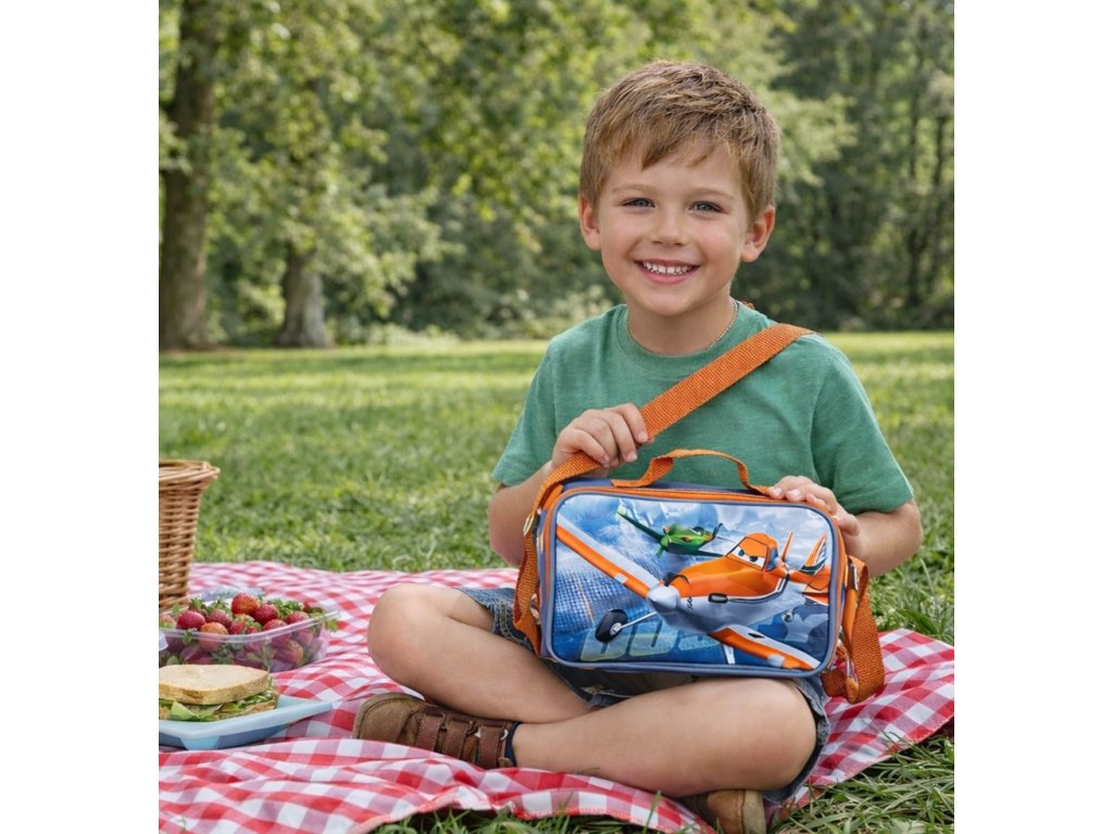 Taška nabízí jeden prostorný oddíl se zapínáním na zip, do kterého se pohodlně vejde svačinová dóza i láhev s nápojem. Nastavitelný popruh přes rameno umožňuje pohodlné nošení dětem různého věku, zatímco poutko do ruky oceníte při krátkém přenášení.