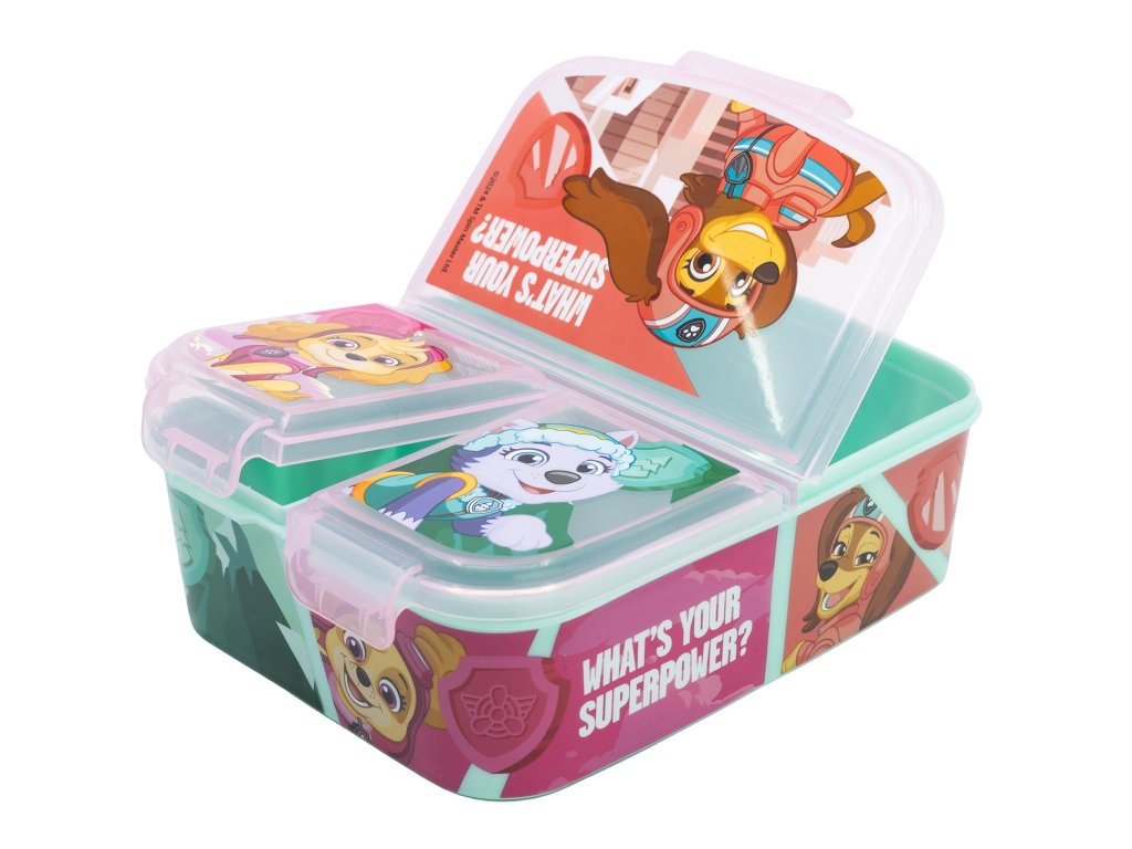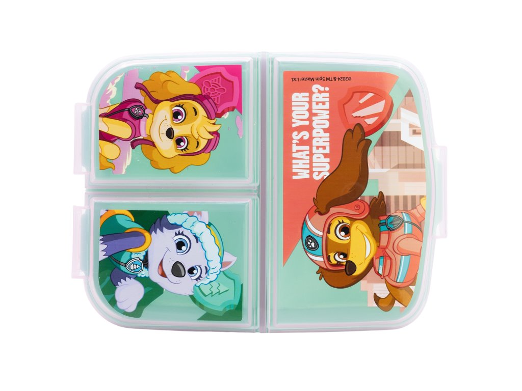 Praktický tříkomorový box na svačinu Paw Patrol do školy i na výlety. Svačinová krabička má jeden větší prostor na hlavní svačinku a dva menší na ovoce a dobrůtku, která nesmí chybět. Děti si jej Vyrobeno z odolného, zdravotně nezávadného materiálu, odolá i náhodným pádům a nárazům při každodenním používání.