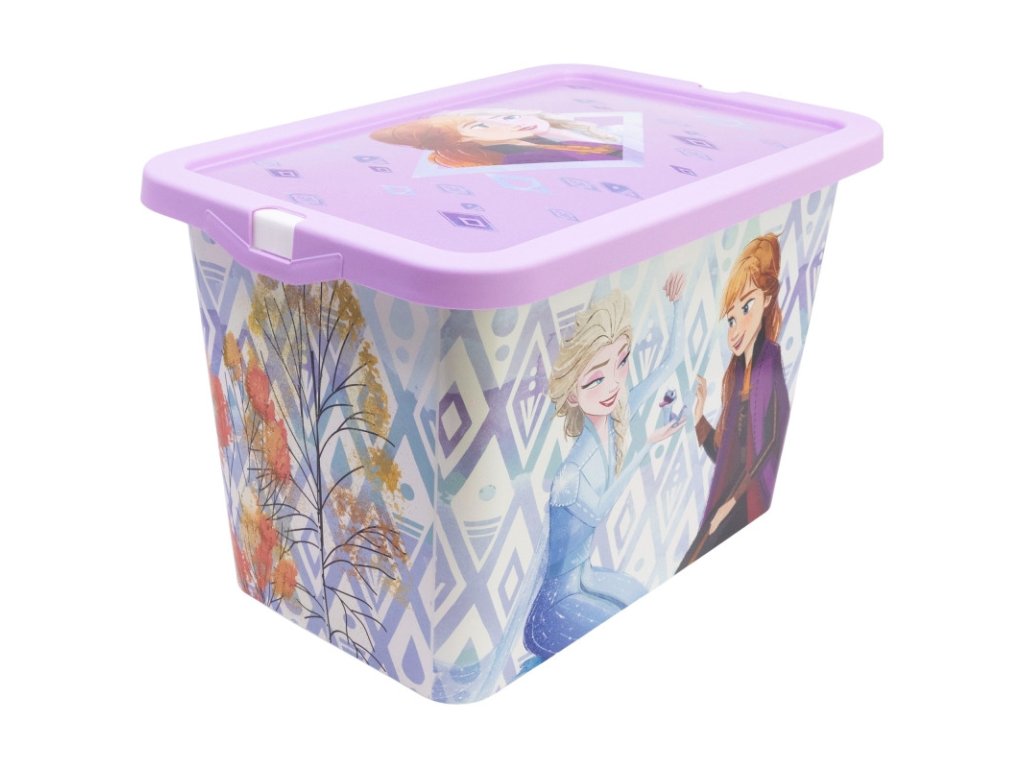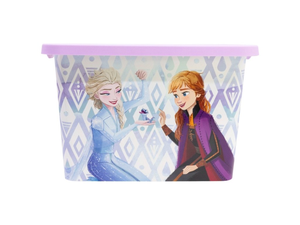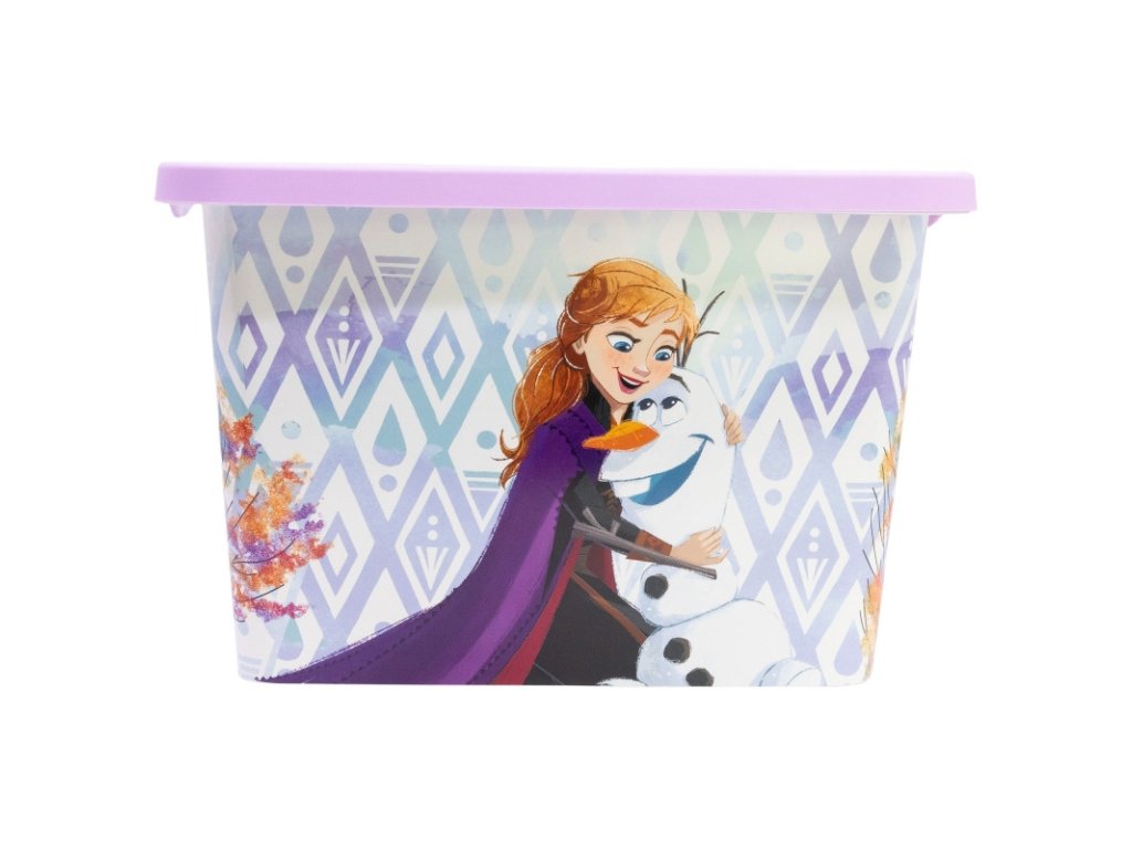 Fialový úložný box s motivem oblíbené pohádky Frozen nabízí dostatek prostoru pro hračky, stavebnice, pastelky, kreativní potřeby i další dětské poklady. Díky odnímatelnému zacvakávacímu víku zůstane obsah bezpečně uložený a chráněný před prachem.