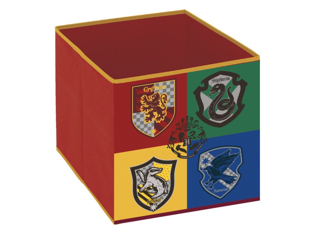 Na boxu jsou výrazné a barevné znaky všech čtyř kolejí – červený Gryffindor, zelený Slytherin, žlutý Hufflepuff a modrý Ravenclaw, doplněné o znak Bradavic uprostřed. Díky tomu se stane nejen praktickým úložným prostorem, ale i stylovou dekorací, která rozzáří každý dětský pokoj.